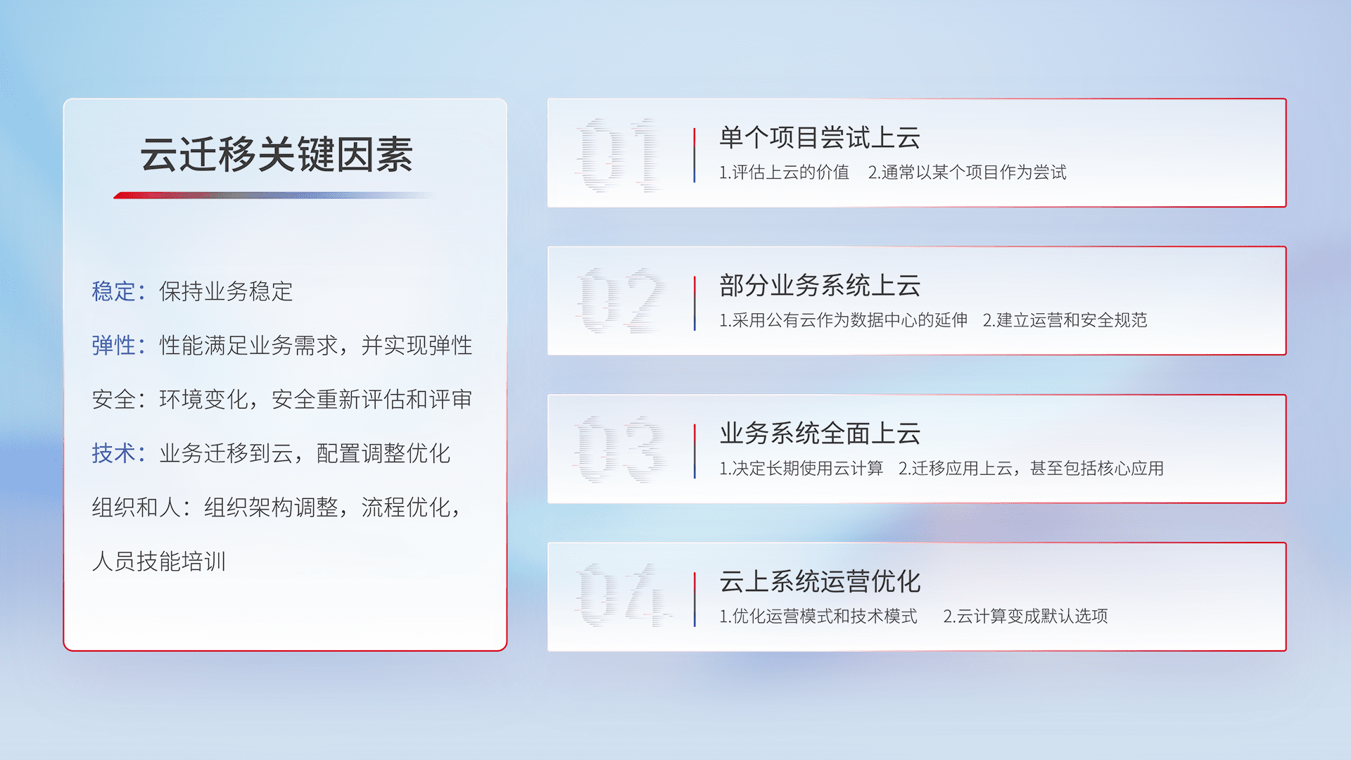 结合实际业务,,从规划设计、、、云平台选型、、、云原生改造、、数据迁移、、、、集成交付,,,迁移全过程为客户识别最佳上云路径,,,做好风险识别管理,,,,设计网络架构、、、、身份权限、、安全审计合规、、、操作审计、、、、日志审计、、、、监控告警策略、、、、多站点容灾设计等,,对云上基础设施进行整体规划,,,提升IT治理水平,,,以满足弹性、、高可用、、、高性能的需求。。。