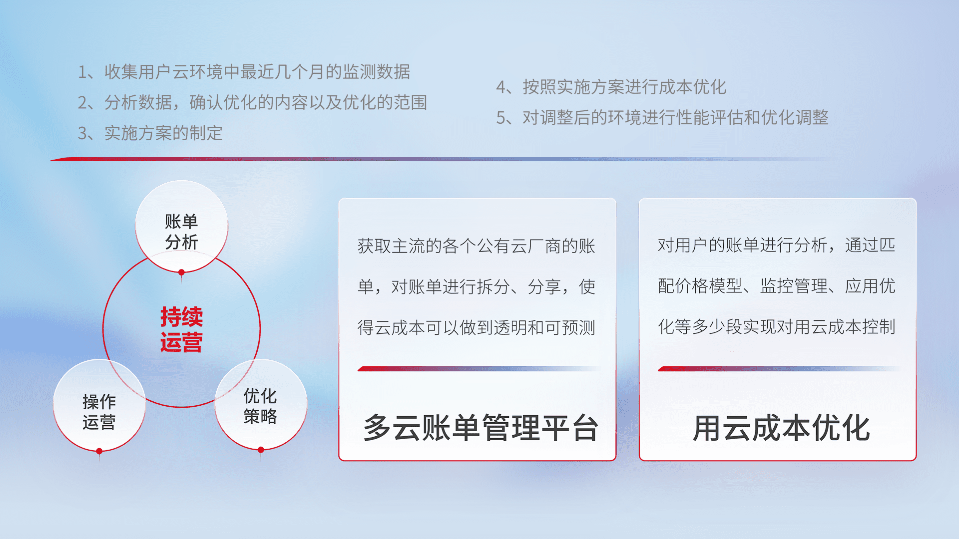 通过多云纳管,,以统一的资源数据模型把客户的云资源进行抽象和封装,,,进而实现对多云资源的统一操作,,,保障云资源管理的可靠性、、、、稳定性与可用性。。。。量身定制化运维内容,,配置、、、开发运维、、、、补丁管理、、、、备份、、、监控、、、、认证和访问管理、、、审计和日常巡检等,,保障在用云过程中的可靠度,,,稳定度以及高可用率。。