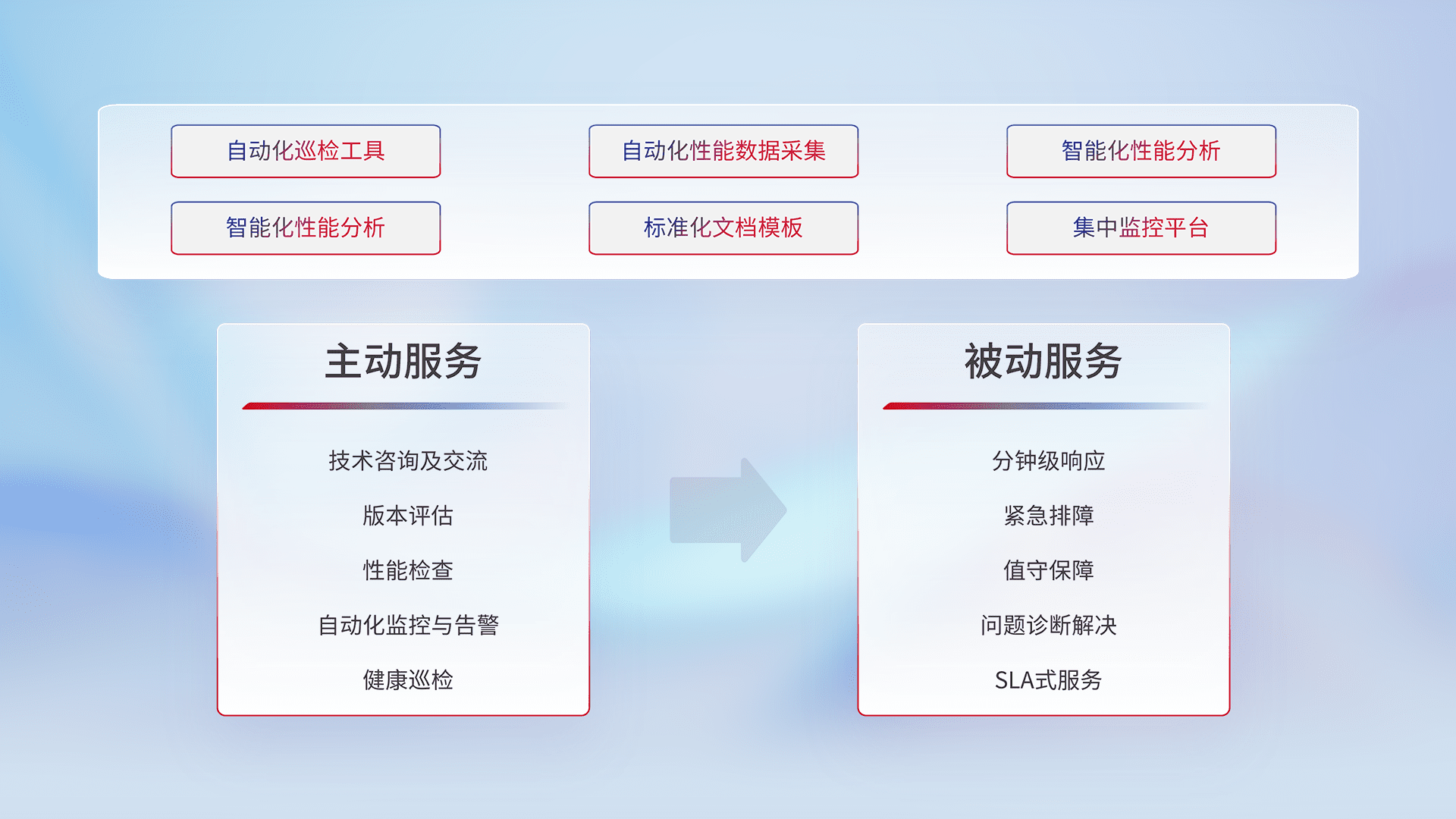 智能化工具和标准化文档,,,保障服务质量,,,,提供主动服务(包含技术咨询、、、、版本评估、、性能检查、、自动化监控与告警、、健康巡检)和被动服务包含(分钟级响应、、、、紧急排障、、、、值守保障、、问题诊断解决、、SLA服务)。。